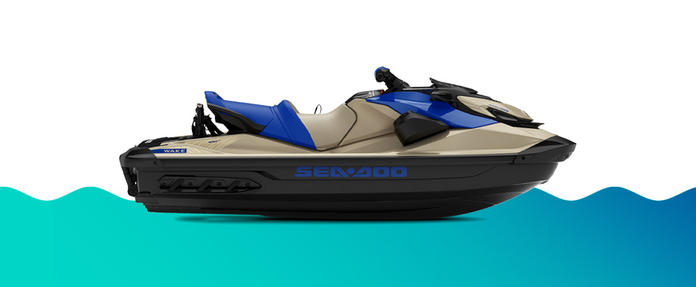 O Sea-Doo Wake 170 2026 impressiona pelo desempenho e estilo, com motor 1630 ACE de 170 hp e as cores Areia e Azul Dazzling.